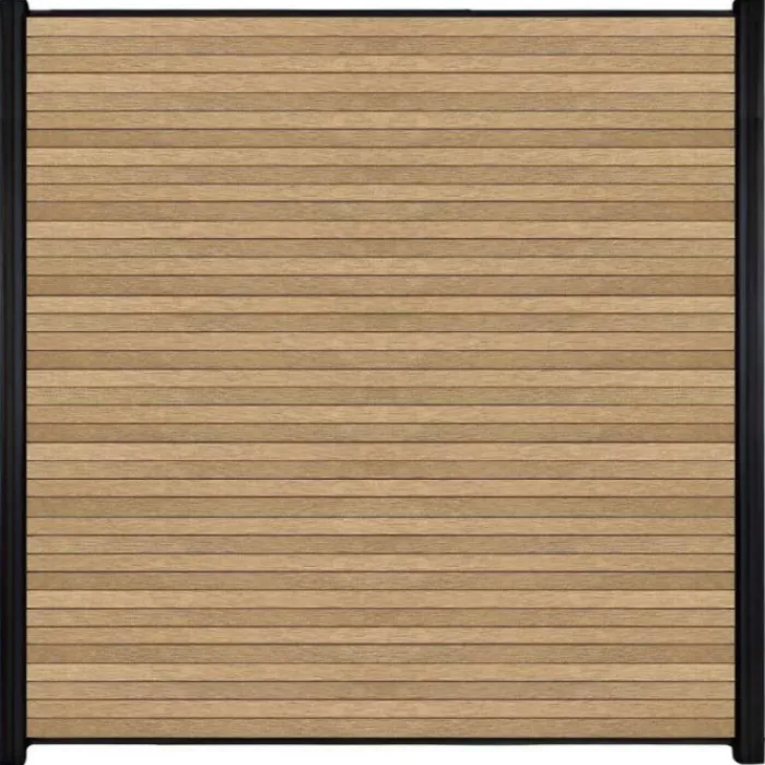 C-Wood zelfbouw schutting composiet Rhombus Triple teak met zwart aluminium accessoires. Geschikt om een scherm te maken van 200 cm hoog en maximaal 180 cm breed. De breedte is eenvoudig in te korten.