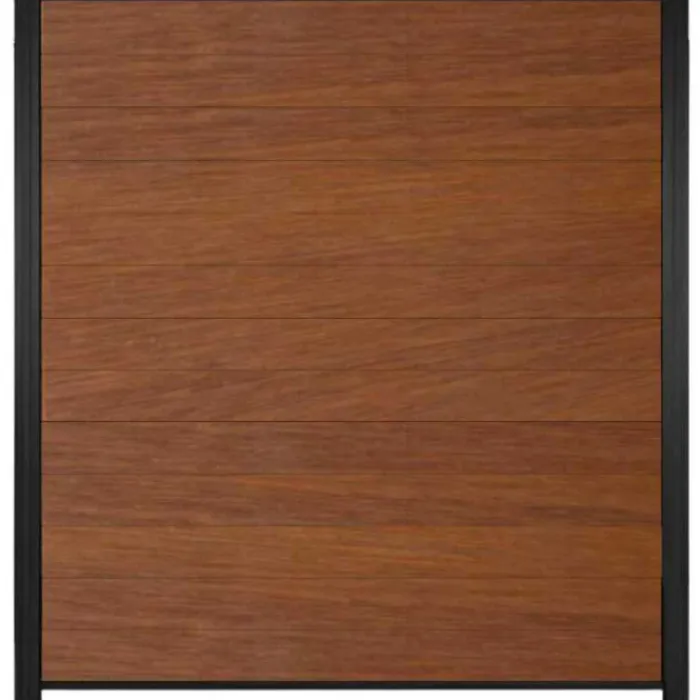 C-Wood zelfbouw schutting hardhout Mix & Match Bamboe met zwart aluminium accessoires. Afmeting is 180 x 200 cm. De schuttingdelen schuif je van bovenaf tussen de C-Wood Modular / Mix & Match palen. De volgorde van de verschillende planken kan je zelf bepalen. Je begint onder en eindigt bovenop. De netto hoogte van deze schutting is enkele centimeters lager dan de opgegeven 200 cm.
