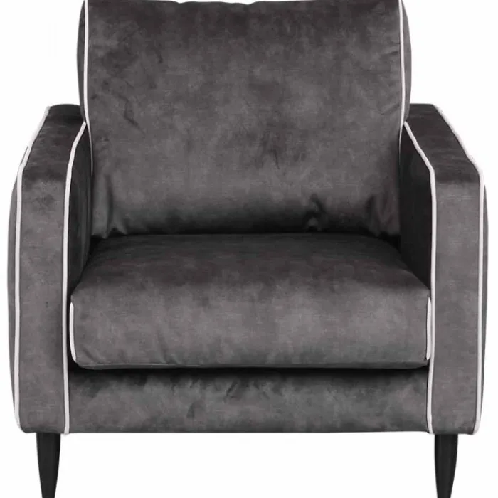 Deze trendy fauteuil is uitgevoerd in de stof velours Adore antraciet met een wit biesje. Dit is een zachte stof met een rijke uitstraling. Door de velours stof krijgt de fauteuil een zeer opvallende en rijke uitstraling. Daardoor is deze fauteuil uitermate geschikt voor ieder interieur. De Rör heeft een zacht, maar stevige zitting. De fauteuil heeft 4 metalen poten.