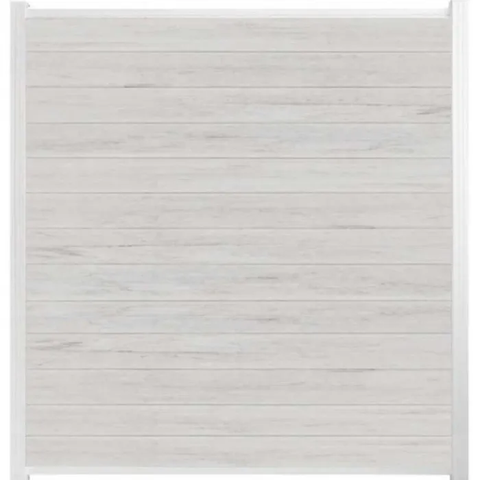 Schutting composiet co-extrusie Garda bi-color met wit aluminium kader (180 x 200 cm). Deze schutting wordt geleverd als een zelfbouw pakket waarmee je zelf een unieke schutting kunt maken.