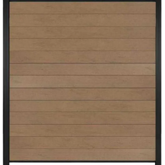 C-Wood zelfbouw schutting composiet Mix & Match bruinvlam met zwart aluminium accessoires. Afmeting is 180 x 200 cm. De schuttingdelen schuif je van bovenaf tussen de C-Wood Modular / Mix & Match palen. De volgorde van de verschillende planken kan je zelf bepalen. Je begint onder en eindigt bovenop. De netto hoogte van deze schutting is enkele centimeters lager dan de opgegeven 200 cm.