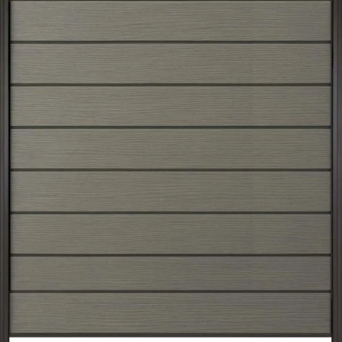C-Wood zelfbouw schutting composiet Modular co-extrusie grijs met antraciet aluminium accessoires. Geschikt om een scherm te maken van 180 cm hoog en maximaal 180 cm breed. De breedte is eenvoudig in te korten. De netto hoogte van het scherm is enkele centimeters lager dan de opgegeven 180 cm.