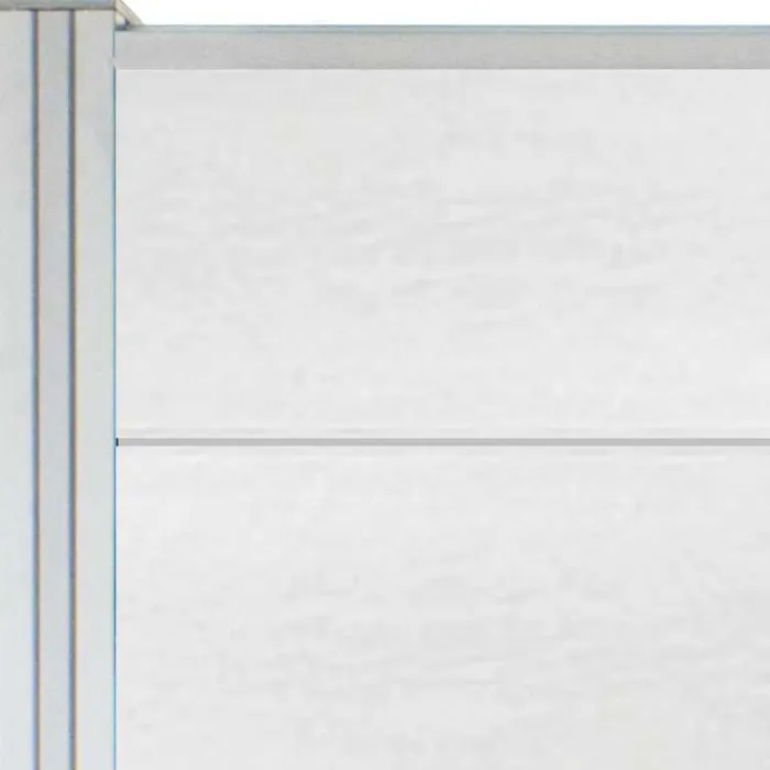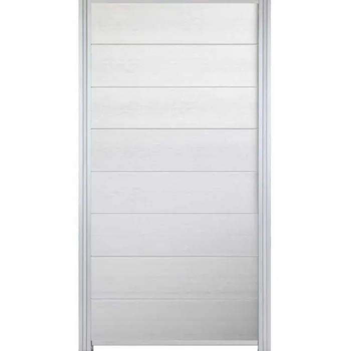 C-Wood zelfbouw schutting composiet Modular wit met blank aluminium accessoires. Geschikt om een scherm te maken van 180 cm hoog en maximaal 90 cm breed. De onderdelen dien je in de breedte in te korten om tot 90 cm breed te komen.