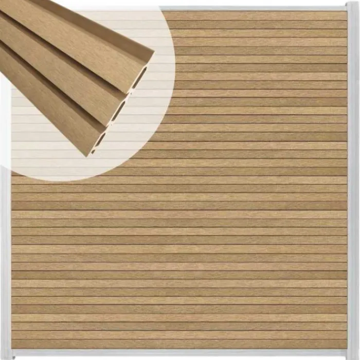 C-Wood zelfbouw schutting composiet Rhombus Triple teak met blank aluminium accessoires. Geschikt om een scherm te maken van 200 cm hoog en maximaal 180 cm breed. De breedte is eenvoudig in te korten.