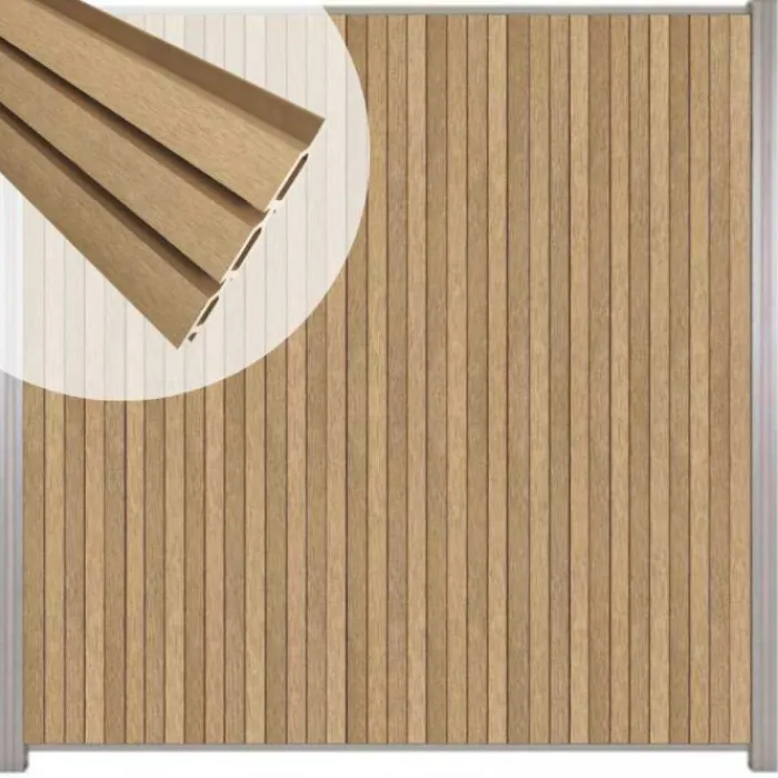 C-Wood zelfbouw schutting composiet Rhombus Triple teak met blank aluminium accesoires. Met deze bundel kun je een verticale schutting bouwen circa 170 cm breed en 180 cm hoog.