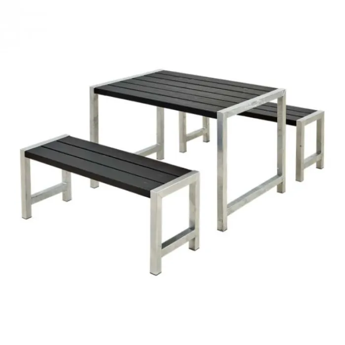 De Plus Danmark tuinset is gemaakt van vuren hout en is gegrond in de kleur zwart (RAL 9005). Tafel met banken leverbaar met of zonder rugleuningen. Het onderstel is gemaakt van thermisch verzinkt staal en is 45 x 45 mm met een verstelbare voetsteun (0-15mm). Geschikt voor 4 personen. Bouwpakket, deels voorgemonteerd, zelf in elkaar zetten.