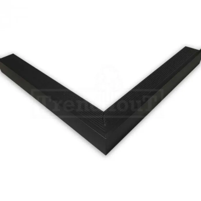 Trendhout daktrim aluminium zwart recht buitenhoek 50 x 50 cm (60 x 64 mm). Dient als afscherming van de bovenzijde van een boeiboord, en wordt aangebracht bij een dak- of gootrand. Voornamelijk gebruikt bij de aansluiting van dakbedekking van een plat dak.
