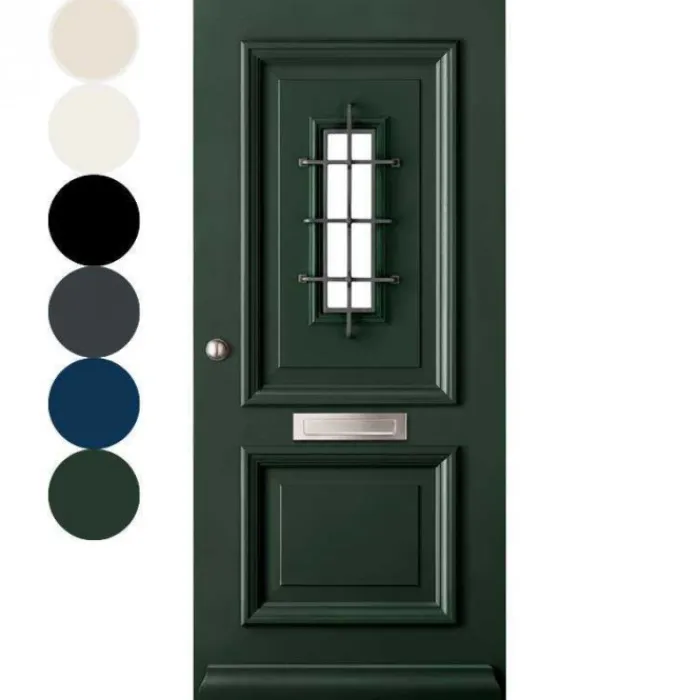 Deze klassieke voordeur uit de serie City Line is gemaakt van Merbau hardhout. Deze voordeur heeft typisch Nederlandse facetprofielen met glas en een rooster (gemaakt van smeedijzer). Achter dit rooster zit een draairaam gemonteerd met mat chroom-kleurig draairaambeslag. De deur is voorbehandeld met een grijs kleurige Prime Quality verf. Deze is gemaakt op basis van alkydhars (120 mi Sigmalitch A22). Na de montage dient de deur nog afgelakt te worden in de gewenste kleur voor de garantie (zie ook de bijlage verwerkingsvoorschriften, garantie en voorwaarden). Het is ook mogelijk om de deur af te laten lakken tegen een meerprijs. Het is hierbij aan te raden om voor alle deelbewerkingen te kiezen. Ga je bijvoorbeeld zelf scharnieren infrezen, dan dien je deze nogmaals van de benodigde verlagen te voorzien. Bij de deur Hoorn is een briefsleuf mogelijk.