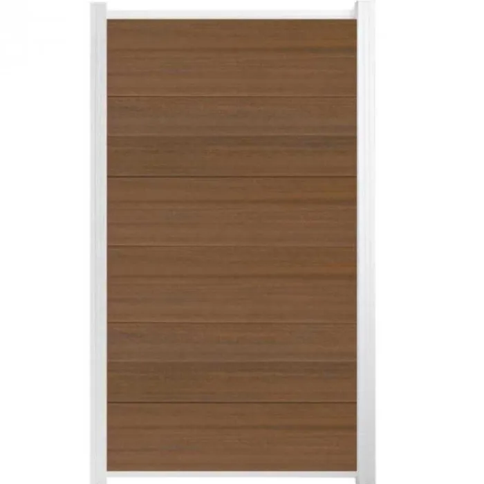 Schutting composiet co-extrusie Como teak met wit aluminium kader (90 x 180 cm). Deze schutting wordt geleverd als een zelfbouw pakket waarmee je zelf een unieke schutting kunt maken.