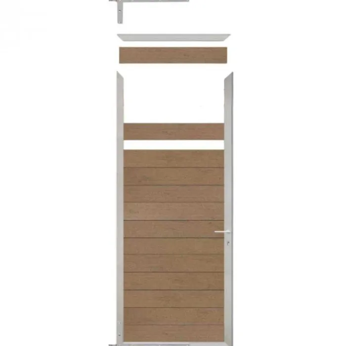 C-Wood zelfbouw tuinpoort Mix & Match blank aluminium frame met composiet bruin gevlamd lamellen. Afmeting 90 x 200 cm. De netto hoogte van deze tuinpoort is enkele centimeters lager dan de opgegeven 200 cm. De poort wordt geleverd inclusief deurbeslag.