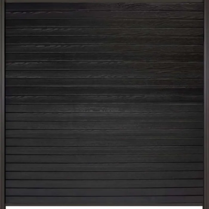 C-Wood zelfbouw schutting composiet Rhombus Double zwart met zwart alu accessoires. Geschikt om een scherm te maken van 180 cm hoog en maximaal 180 cm breed. De breedte is eenvoudig in te korten.