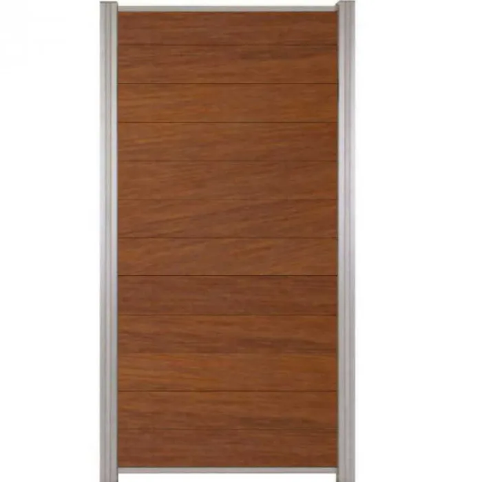C-Wood zelfbouw schutting hardhout Mix & Match Bamboe met blank aluminium accessoires. Afmeting is 90 x 180 cm. De schuttingdelen schuif je van bovenaf tussen de C-Wood Modular / Mix & Match palen. De volgorde van de verschillende planken kan je zelf bepalen. Je begint onder en eindigt bovenop. De netto hoogte van deze schutting is enkele centimeters lager dan de opgegeven 180 cm.