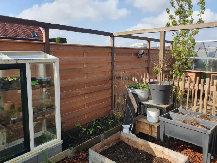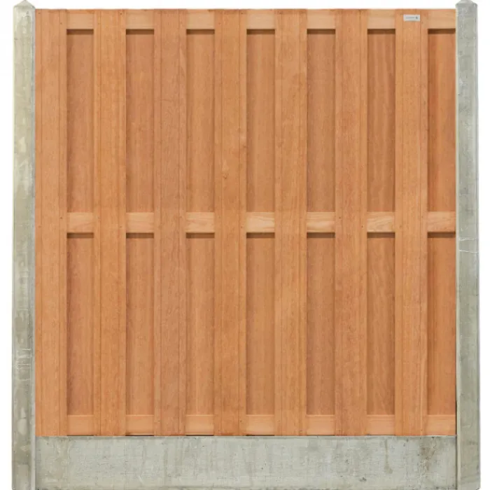 Uitvoering: Hardhout (keruing) schutting 180 x 180 gecombineerd met grijze betonpalen en een grijze latei. Hierdoor kom je uit op 197 x 200 cm.