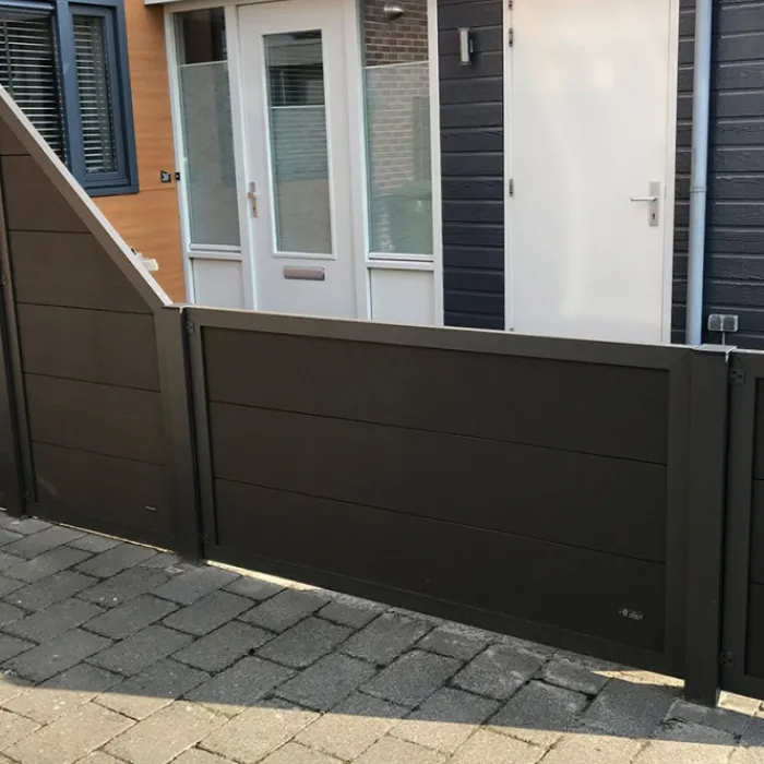 Hot Elephant Schutting composiet Design donkerbruin met blank aluminium frame (180 x 180 cm)
