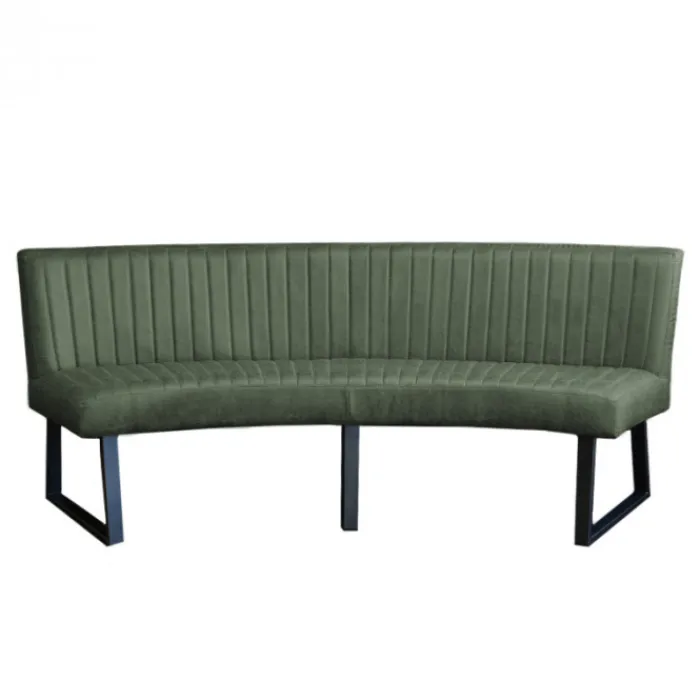 HomingXL ovale eetkamerbank geschikt voor een ovale tafel met een afmeting van 200 cm. Deze stoere ovale eetkamerbank Hengelo is gestoffeerd met de prachtige groen-kleurige lederlook stof Missouri 10. De bank is uitgevoerd met zwarte metalen poten. Deze eetkamerbank heeft een stoere uitstraling en is zowel geschikt voor een industrieel als een modern interieur.
