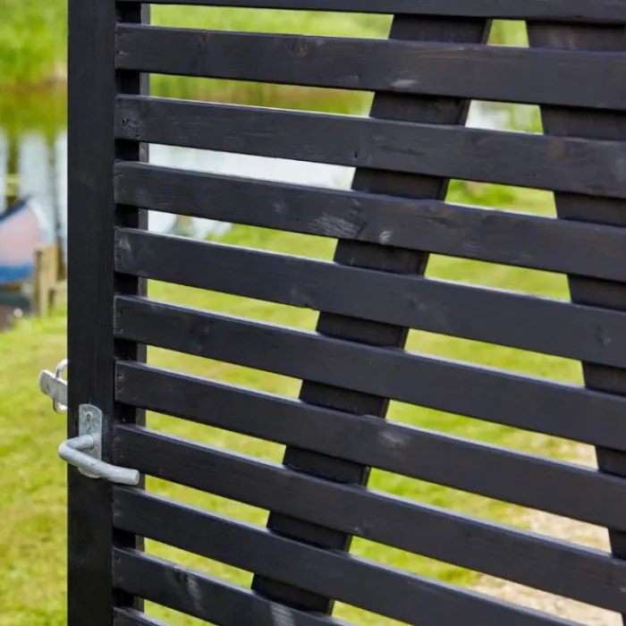 Plus dubbele tuinpoort recht vuren geïmpregneerd en zwart gegrond uit de serie Tokyo. De afmetingen van deze tuinpoort is 200 x 180 cm (b x h). De afstand tussen de latten is 21 mm. Kleur: zwarte grondlaag op waterbasis, dichtstbijzijnde RAL 9005 (dient afgebeitst te worden).