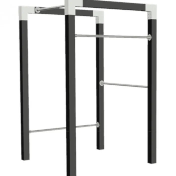 Plus outdoor fitnesstoestel gemaakt van geïmpregneerd Scandinavisch sparrenhout. Na het impregneren is het hout gebeits met een zwarte beits op waterbasis (RAL 9005).