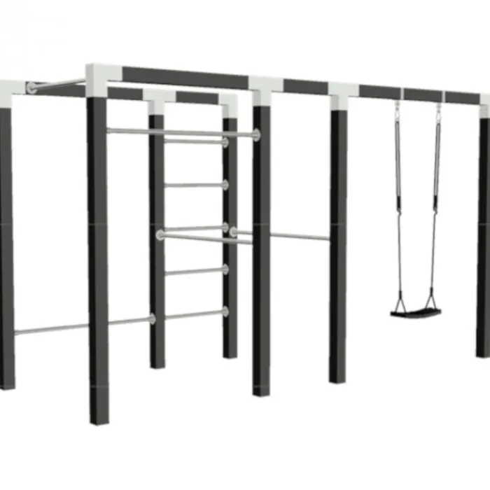 Plus outdoor fitnesstoestel gemaakt van geïmpregneerd Scandinavisch sparrenhout. Na het impregneren is het hout gebeits met een zwarte beits op waterbasis (RAL 9005).