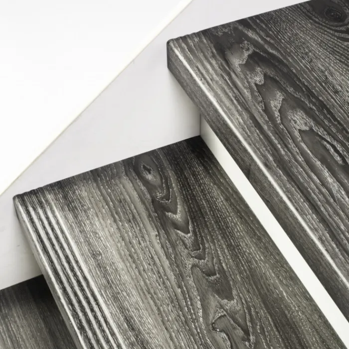 Dit is een complete Stepwoord traprenovatieset met SPC toplaag traptreden in de kleur antraciet met witte stootborden, inclusief montagekit, uitloopprofiel en afwerkingskit. Deze complete set is geschikt voor een rechte trap met 13 treden. De set wordt geleverd inclusief witte stootborden, omdat het een set voor een dichte trap betreft.