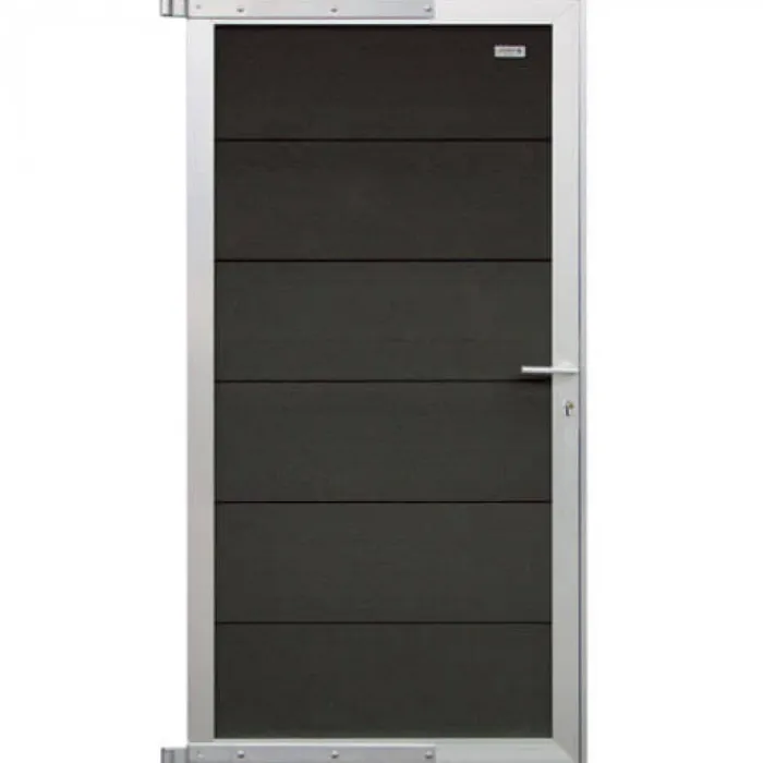 Tuindeur composiet Forte Antraciet met hang- en sluitwerk, slot en blank aluminium kader 90 x 180 cm. Afhankelijk van hoe je het hang- & sluitwerk monteert is deze deur links- of rechtsdraaiend.