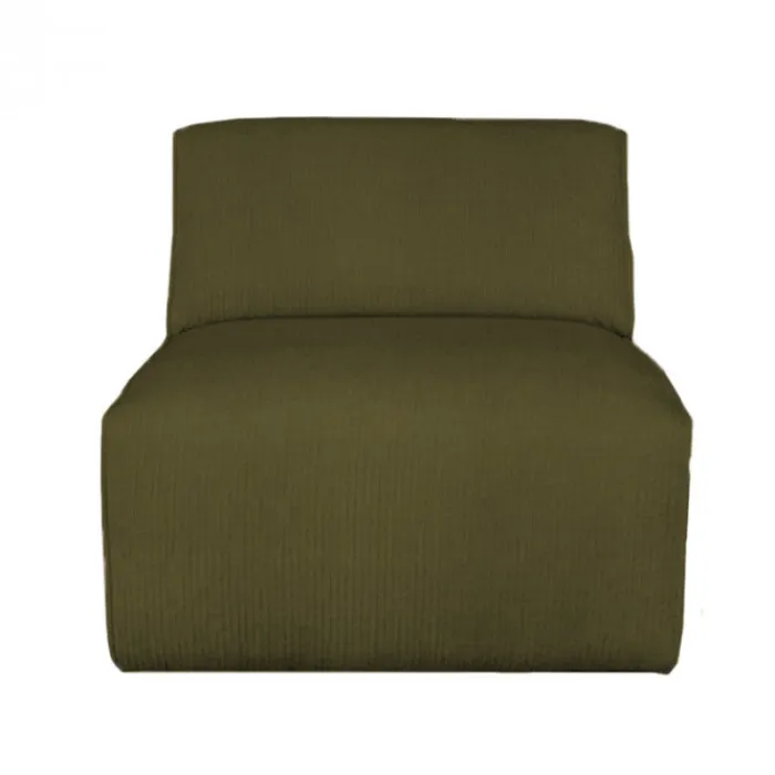 De 3-zits bank bestaat uit losse modules: een lounge element, een tussen stuk en een hoekmodule met armleuning. De modules zijn bekleed met de stof Rackham in de kleur groen.