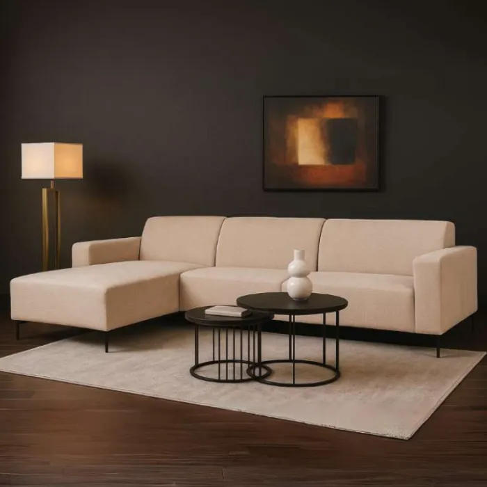 De hoekbank Ronald staat op robuuste metalen poten die zorgen voor een industriële uitstraling. De strakke armleuningen aan beide zijden maken het design compleet en bieden een comfortabele ondersteuning.