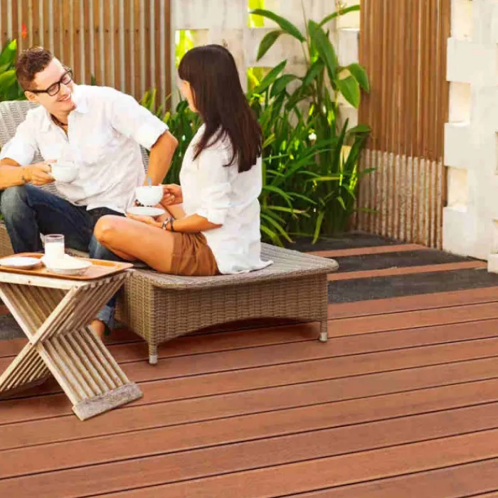 aMbooo vlonderplank bamboe Primus geolied coffee 2,0 x 14 cm (2,20 mtr) groef/fijne ribbel. Vlonder totaalpakket voor 1 m2 gelegd met bamboe vlonderplanken van 220 cm. Bevat 1 m2 planken, inclusief bijbehorende clips en schroeven. Per m2 zit er ongeveer 2,5 strekkende meter onderbalk bij (lengte van deze onderbalken is 300 cm). De bamboe terrasplanken zijn 2-zijdig geprofileerd en kunnen naar eigen voorkeur gemonteerd worden. De kopse kanten van de planken zijn voorzien van een tong en groef verbinding, waardoor je een prachtige lengte aansluiting kunt creëren in het terras. Met bijbehorende montageclips zijn de vlonderplanken gemakkelijk te monteren.