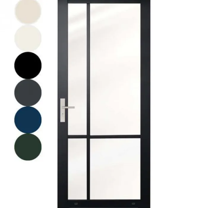 De deur is voorzien van wienersprossen. Dit zijn aluminium strips, zwart gepoedercoat, die het glas verdelen, hierdoor kijk je niet door het glas heen op de plek van de roedes. Dit geeft een luxe uitstraling!
