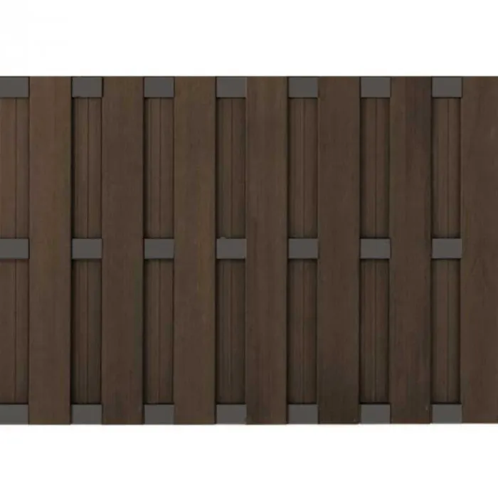 Zelfbouw tuinscherm Bari donkerbruin met antraciet aluminium frame. Met dit pakket maak je een Bari schutting met een hoogte van 123 cm en een breedte van 180 cm. De dikte van het scherm is 2,9 cm. Per schutting heb je 6 x het T-beslag nodig om deze aan een paal te bevestigen.