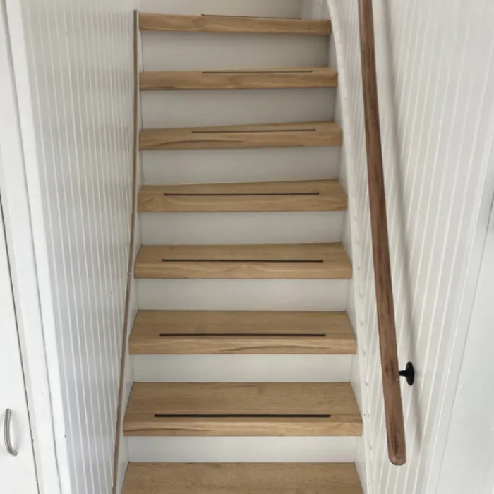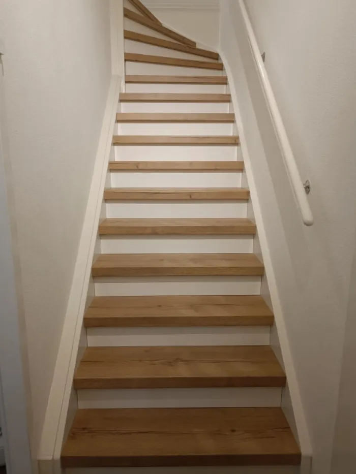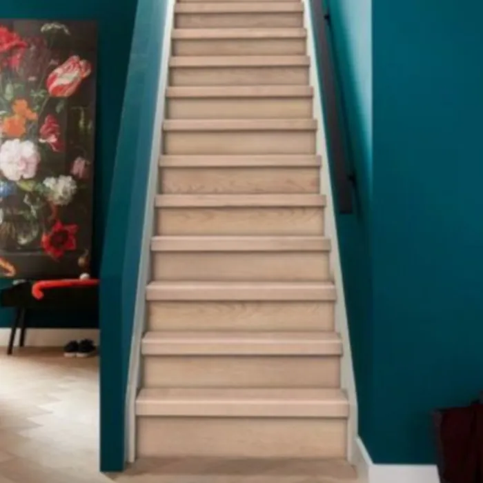 CanDo overzettrede met neus – Laminaat – Licht eiken. Voor de rechte treden van de trap zijn er overzettreden beschikbaar van 100 x 30 cm. Voor de grotere traptreden in huis waar een draai in zit, zijn er overzettreden van 130 x 38 cm beschikbaar.