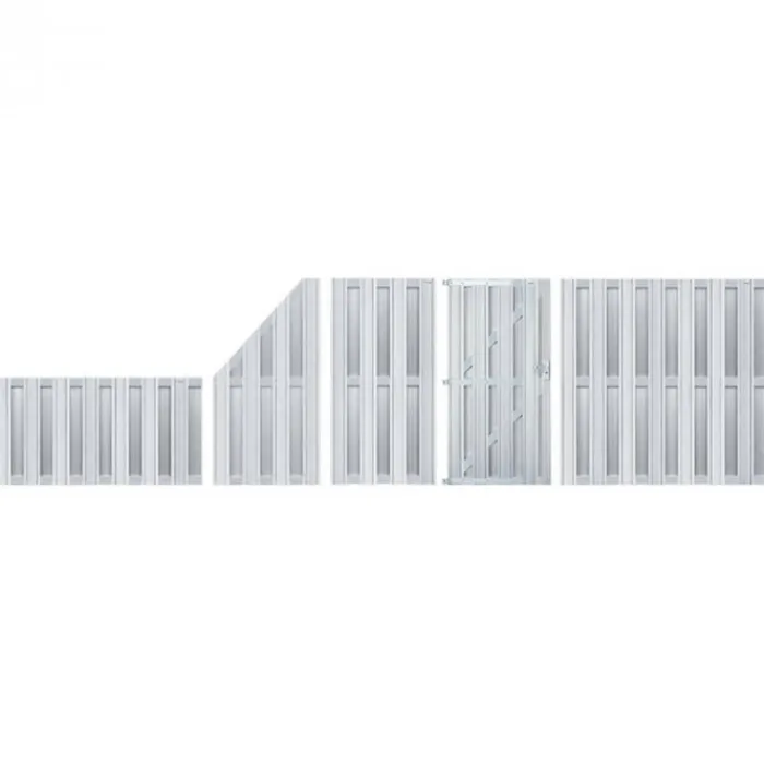 Composiet schutting schuin Design grijs van 90 cm breed. Te combineren met lage schermen van 93 cm hoog en de 180 cm hoge tuinschermen. Bestaat uit aluminium liggers en composiet planken.