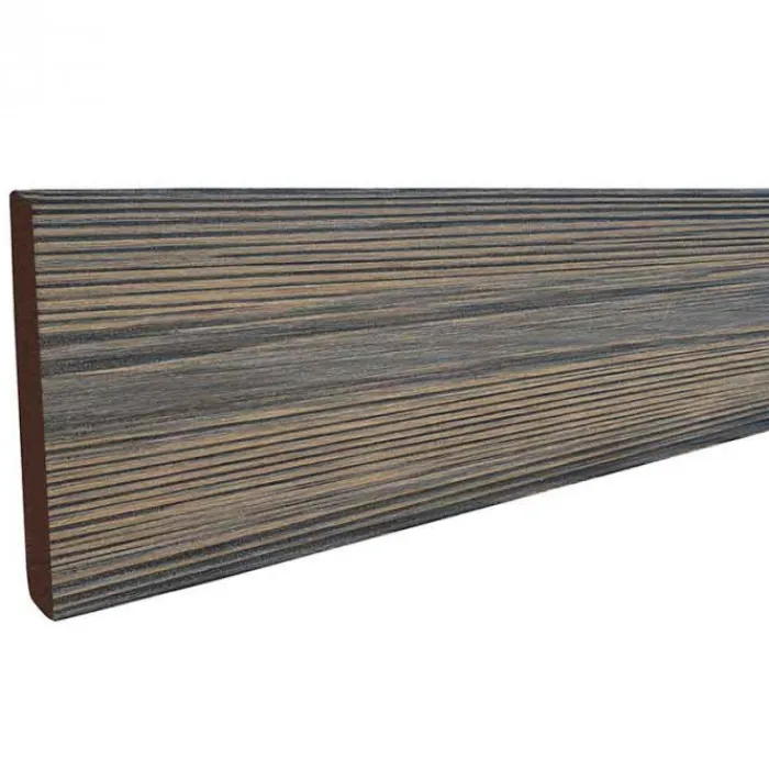 Afwerklijst voor de randafwerking van het terras of vlonder. Passend bij de 21 mm Eva-Last driftwood dark-kleur plank plus een onderbalk van ongeveer 50 mm hoog. De lengte van rechte randprofiel is 300 cm. De hoogte van de kantafwerking is 7,1 cm en 1,1 cm dik.