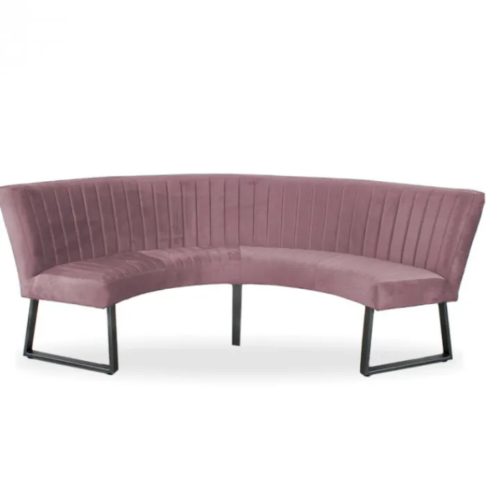 HomingXL ronde eetkamerbank geschikt voor een ronde tafel met een diameter van 150 cm. Deze stoere halfronde eetkamerbank Hengelo is gestoffeerd met de prachtige Element velours stof in de kleur roze. De bank is uitgevoerd met zwarte metalen poten. Deze eetkamerbank heeft een stoere uitstraling en is zowel geschikt voor een industrieel als een modern interieur.