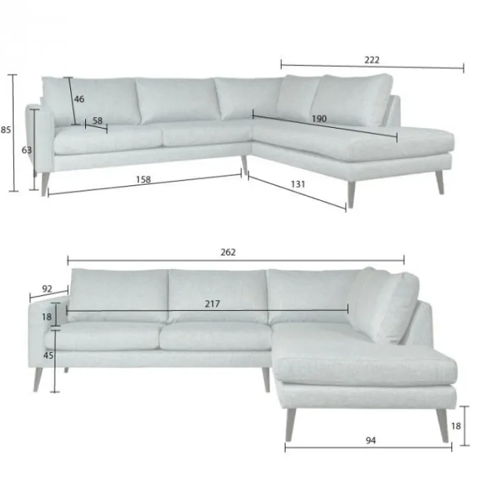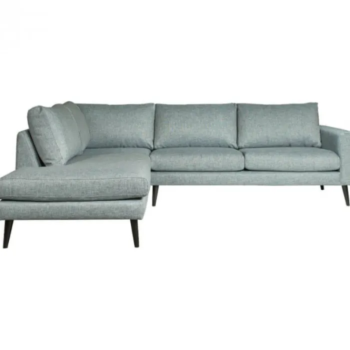 Hoekbank Aster is een hippe loungebank met een Scandinavische look. Dit komt voornamelijk door de rechte vormen en het schuine hoge pootje. De bank is uitgevoerd in de gemêleerde stof Side blauwgrijs 142 en wordt geleverd met zwarte houten poten.