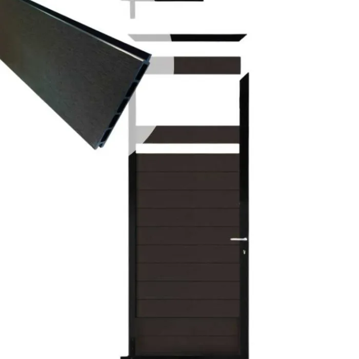 C-Wood zelfbouw tuinpoort Mix & Match zwart aluminium frame met composiet antraciet lamellen. Afmeting 90 x 200 cm. De netto hoogte van deze tuinpoort is enkele centimeters lager dan de opgegeven 200 cm. De poort wordt geleverd inclusief deurbeslag.