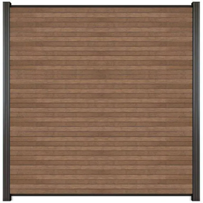 C-Wood zelfbouw schutting composiet Rhombus Triple bruin gevlamd met antraciet aluminium accessoires. Geschikt om een scherm te maken van 200 cm hoog en maximaal 180 cm breed. De breedte is eenvoudig in te korten.