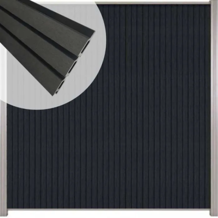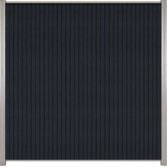 C-Wood zelfbouw schutting composiet Rhombus Triple antraciet met blank aluminium accesoires. Met deze bundel kun je een verticale schutting bouwen circa 170 cm breed en 180 cm hoog.
