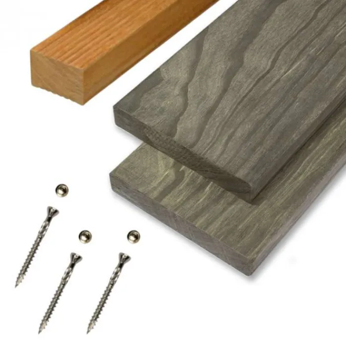 Elephant vlonderplank totaalpakket hardhout Accoya gray 2,5 x 14,5 cm (4,80 mtr) vlak geschaafd. Vlonder totaalpakket voor 1 m2 gelegd met hardhouten vlonderplanken van 480 cm. Per m2 zit er ongeveer 2,9 strekkende meter onderbalk bij (lengte van de onderbalken is 365 cm). Bij dit pakket wordt geen rekening gehouden met snijverlies.