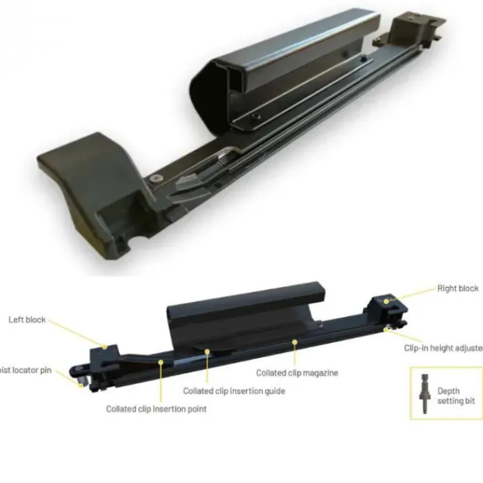 De handtool is eenvoudig te laden. Elk clipmagazijn schuift via de geleider in de handtool en deze past tegen de plankgroef, waardoor de clip en de schroef correct worden gepositioneerd voor bevestiging. Na het bevestigen dien je de handtool van de clip weg te draaien om het van de rest van de bundel af te scheuren. Zodra een volledige rij is geïnstalleerd, kan de volgende plank onder de veer van de geïnstalleerde clips geschoven worden, waarbij je zachtjes met een hamer tikt om ervoor te zorgen dat de volgende plank volledig vastzit.
