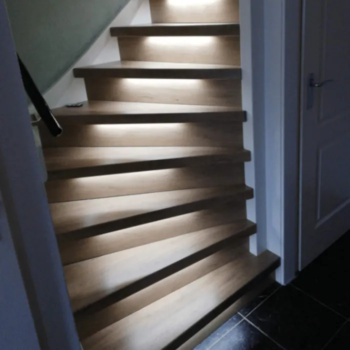 HomingXL kant-en-klare LED trapverlichting set. De LED-strip is geplaatst in een profiel. Deze set is compleet voor een trap tot en met 15 treden. De LED strips van 50 cm geven een helder wit licht en hiermee kun je het looppad verlichten. De strips zijn voorzien van dubbelzijdig tape waardoor je deze eenvoudig aan de trede plakt. Indien gewenst kun je de LED-strip eenvoudig inkorten. Optioneel kun je de set voorzien van sensoren waarmee de verlichting dmv beweging aan zal gaan.