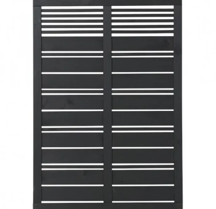Plus tuinscherm recht vuren geïmpregneerd en zwart afgelakt uit de serie Silence. De afmetingen van dit scherm zijn 120 x 170 (b x h). RVS geschroefd.