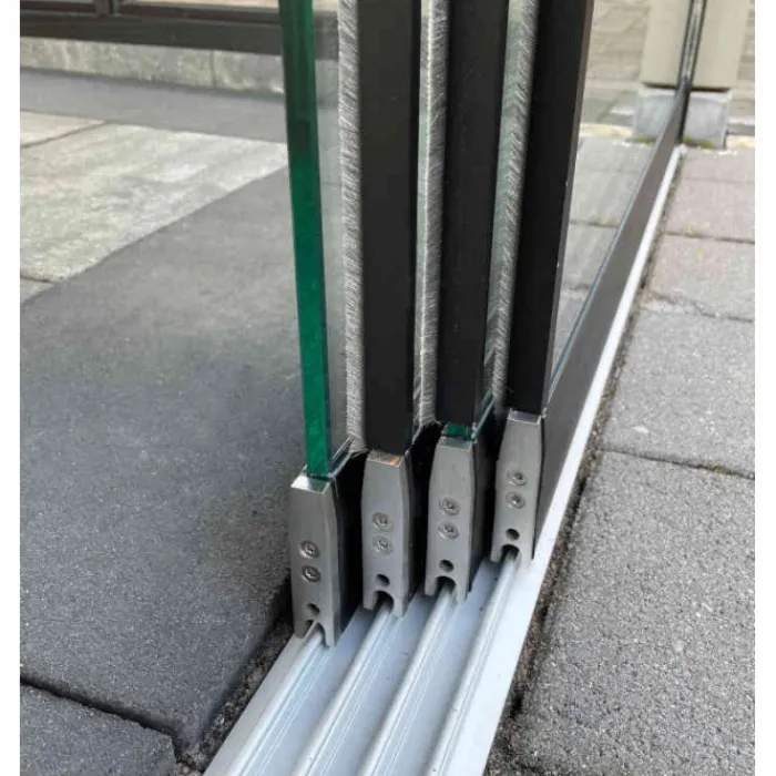 Trendhout glazen schuifwand van 2270 mm hoog en maximaal 2760 mm breed. Dit is een naar links schuivende wand. De glazen panelen zijn 10 mm gehard veiligheidsglas en voorzien van kogelgelagerde en verstelbare wielen. De panelen staan in een 3-sporige rail. De onderrail is geanodiseerd aluminium en de bovenrail is verkrijgbaar in diverse RAL kleuren. Panelen zijn voorzien van een RVS handgreep, deze is in het glas geboord en bevestigd.