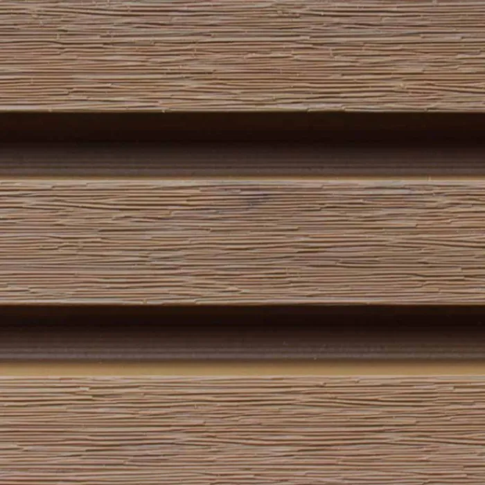 De plank heeft een natuurlijke houtuitstraling door de kleur en nagebootste houtstructuur. Het trapezevormige profiel geeft het geheel een moderne en strakke uitstraling.