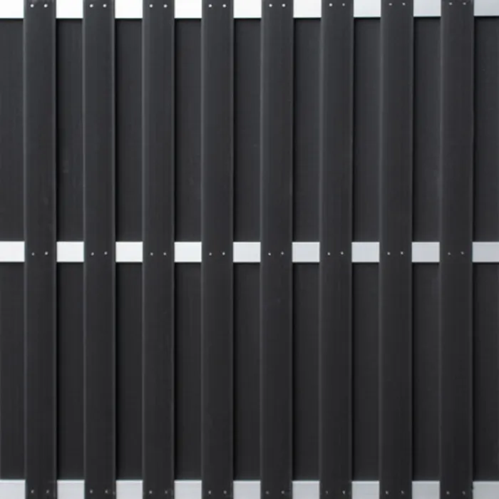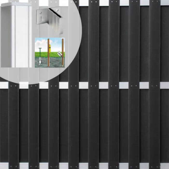 Complete set van 4 tuinschermen Capri Antraciet met blank aluminium frame 180 x 180 cm. Aangevuld met 5 aluminium tuinpalen 6,8 x 6,8 cm lengte 272 cm. Hiermee kun je een afscheiding maken van maximaal 7,54 meter breed en 1,80 meter hoog. De schuttingen zijn eenvoudig in de breedte in te korten door een of meerdere kunststof lamellen eraf te schroeven. De aluminium liggers kun je inkorten met een ijzerzaag.
