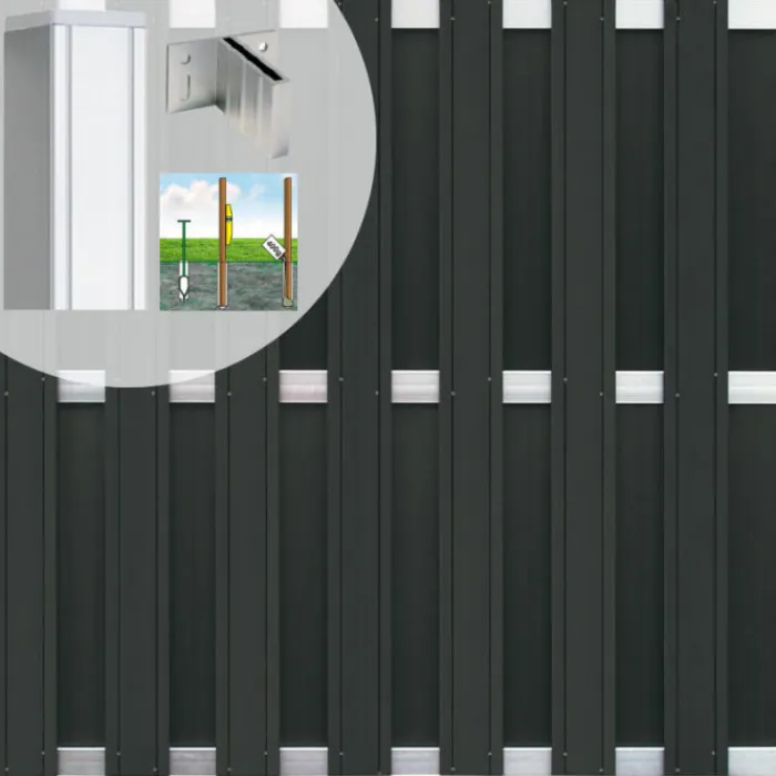 Complete set van 3 tuinschermen Stijl Antraciet met blank aluminium frame 180 x 180 cm. Aangevuld met 4 aluminium tuinpalen 6,8 x 6,8 cm lengte 272 cm. Hiermee kun je een afscheiding maken van maximaal 5,67 meter breed en 1,80 meter hoog. De schuttingen zijn eenvoudig in de breedte in te korten door een of meerdere kunststof lamellen eraf te schroeven. De aluminium liggers kun je inkorten met een ijzerzaag.