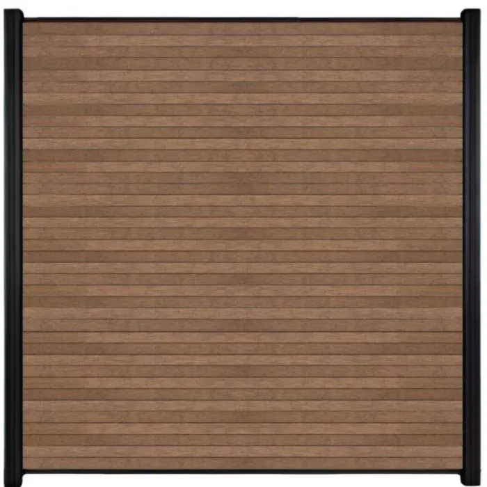 C-Wood zelfbouw schutting composiet Rhombus Triple bruin gevlamd met zwart aluminium accessoires. Geschikt om een scherm te maken van 200 cm hoog en maximaal 180 cm breed. De breedte is eenvoudig in te korten.