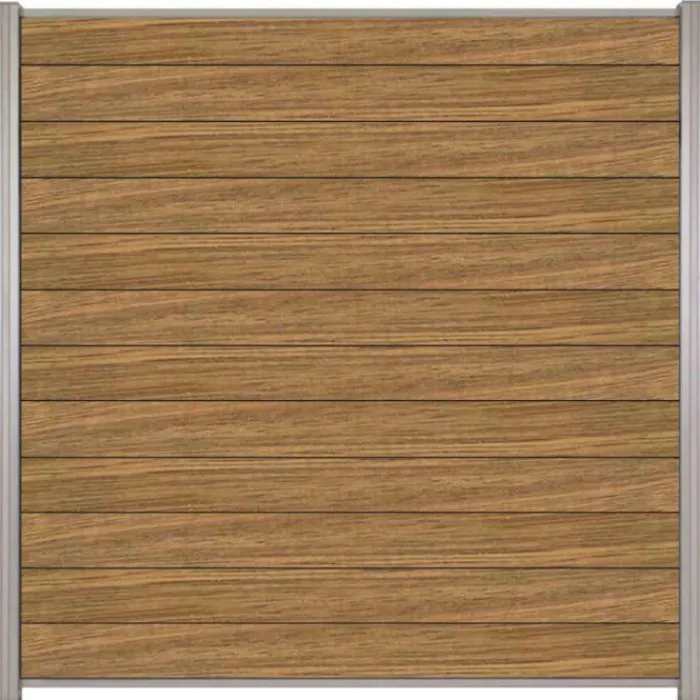 C-Wood zelfbouw schutting hardhout Mix & Match Thermo Fraké met blank aluminium accessoires. Afmeting is 180 x 180 cm. De schuttingdelen schuif je van bovenaf tussen de C-Wood Modular / Mix & Match palen. De volgorde van de verschillende planken kan je zelf bepalen. Je begint onder en eindigt bovenop. De netto hoogte van deze schutting is enkele centimeters lager dan de opgegeven 180 cm.