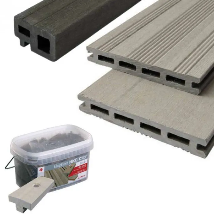 Vlonder totaalpakket voor 1 m2 gelegd met grijs composiet vlonderplanken van 225 cm lang, 2,1 cm hoog en 14,5 cm breed. Pakket bestaat uit vlonderplanken, onderbalken, clips en schroeven om een vlonderterras te maken. Vul het benodigd aantal vierkante meter terras in en de website rekent automatisch uit hoeveel planken je ontvangt. Bij dit pakket wordt geen rekening gehouden met snijverlies.