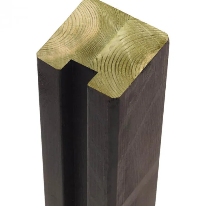 Plus Danmark begin of eindpaal vuren geimpregneerd zwart, ten behoeve van het rabatsysteem van de serie Plus Plank en Plus Klink. De kopmaat is 9 x 9 cm.
