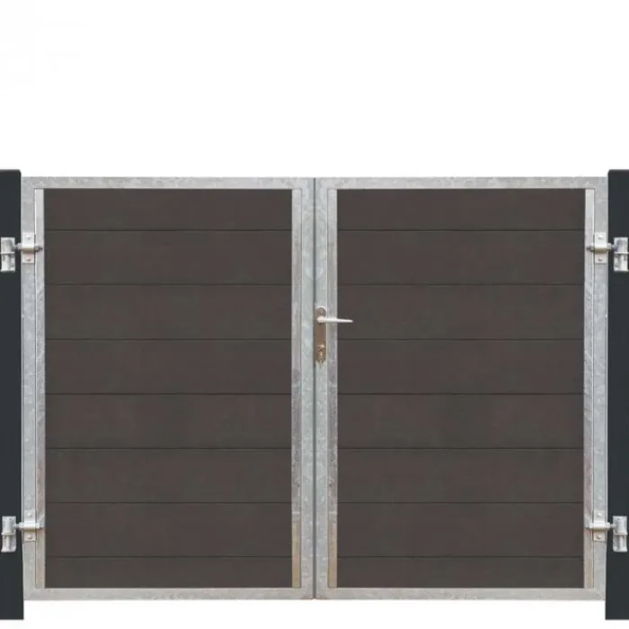 De antraciet kleurige dubbele tuindeur met stalen frame heeft lamellen gemaakt van composiet. De dubbele tuindeur is makkelijk schoon te maken. Het frame is gemaakt van thermisch verzinkt staal. De dubbele tuindeur heeft een afmeting van 99 x 145 cm. De zwart/grijze palen worden meegeleverd. Hierdoor komt je uit op een afmeting van 213 x 145 cm (2x 16 cm palen). De deur gaat naar rechts open.